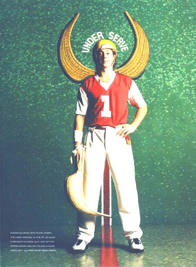 Not today. Not these people. "You stink, number five!" someone shouts from the stands at a frontcourt player known as Gallardo, who has just flubbed a seemingly simple catch. Because the fronton is so empty, so devoid of energy or life, everybody hears the heckler, and more than a few patrons chuckle in assent. Because that's what the players are to this perfunctory crowd: mere numbers, numbers that stand for faceless players with unpronounceable Basque names, numbers who change colored shirts and post positions for each game as the odds shift and slide.Andoni Echaniz, who plays under the name Arriaga, is one of jai-alai's foremost