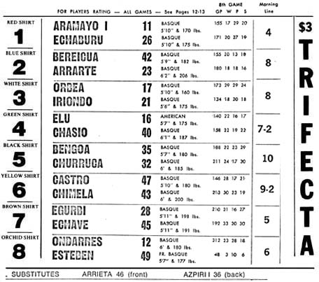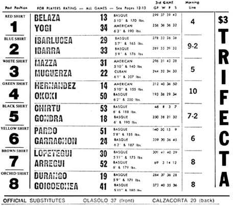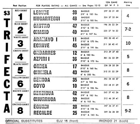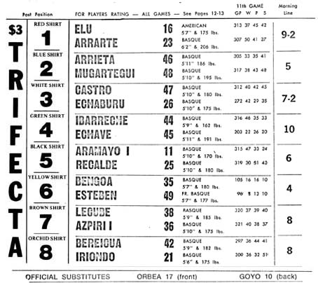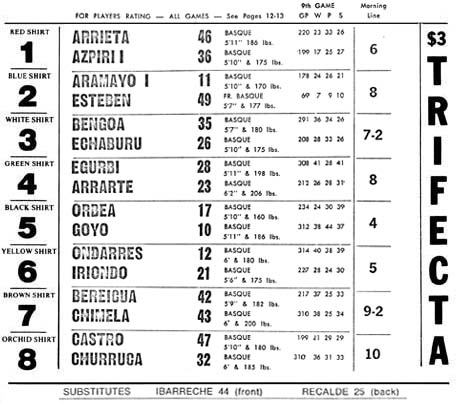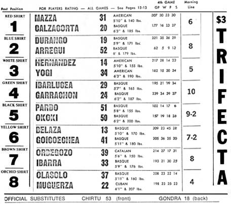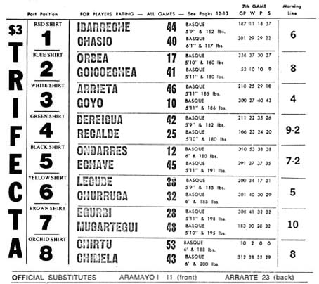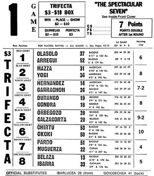 So far I have been giving you theory, percentages and angles. All of this must come together on a practical basis at the fronton. I have chosen a typical program, the Saturday matinee of March 19, 1977 at Bridgeport, to illustrate how I apply some of the principles I have been telling you about.