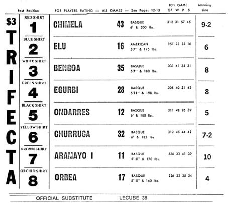 Team 1 has Ibarreche and Chasio. Both are hustling today. Team 6 has Lecube and the great Churruca ("The Human Vacuum Cleaner," so-called because of the way he sucks up any ball that comes his way). Team 8 has Chirtu and Chimela (Jai-alai's 1976 Player of the Year, a human fly who has to be seen to be believed).