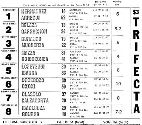 Belaza and Yogi both played well in the last game, as did Chirtu and Gondra. Muguerza is throwing with power today. Lopetegui is 2 points below his regular strength, and Arregui is about 1 point below.