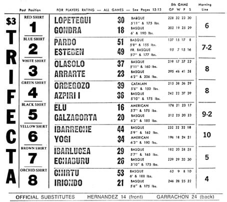 On this basis, Teams 5 and 6 are tied with 20 points; Team 4 has 19; and Team 2 has 17. Therefore, Teams 5 and 6 should be coupled with Team 1 in Quiniela/Perfecta betting. Examining these alternatives, Team 5 is satisfactory. Orbegozo is the best of the frontcourters in the early games at Bridgeport. Calzacorta is a fair backcourt player, making up for his tendency to drop easy * catches by hustling a lot.