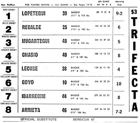 Playing 5 and 6 together is usually not productive, so I look for two other teams to play in the Quiniela or Perfecta with Team 5. Team 3 has Orbea in the front court. He is very dangerous in such an early post position. Team 1 has Aramayo, who is always tough in these middle games, and Echaburu, a solid back court man. In post 1 they should get off to a good start. Team 4 has an excellent record playing together, but a 5-4 combination is not a high frequency Perfecta.