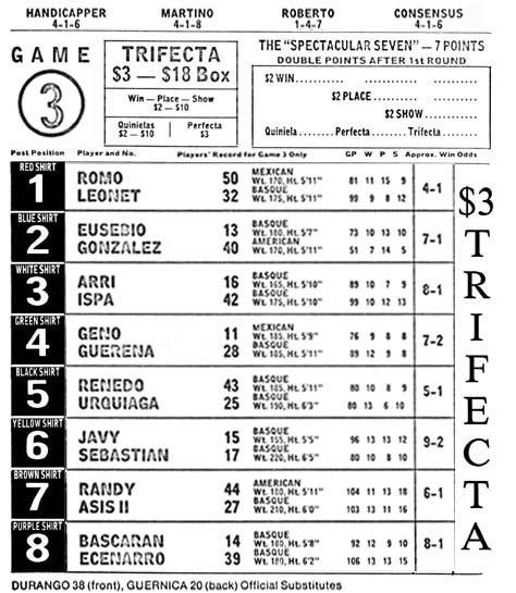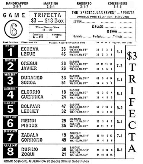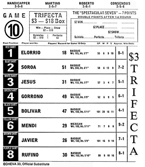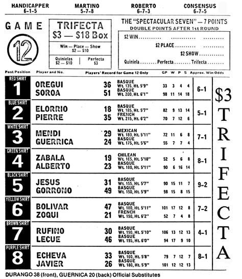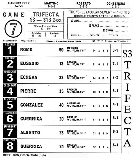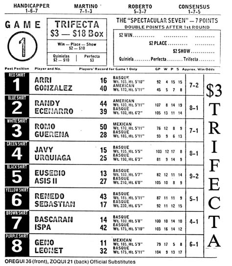 So I begin $12 in the red, even though my highly favored #4 came in second. I note in my program that Geno and Gonzalez looked sharp, while Urquiaga didn't seem to be throwing with his usual firepower. On to the next game.