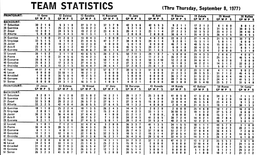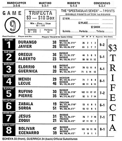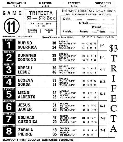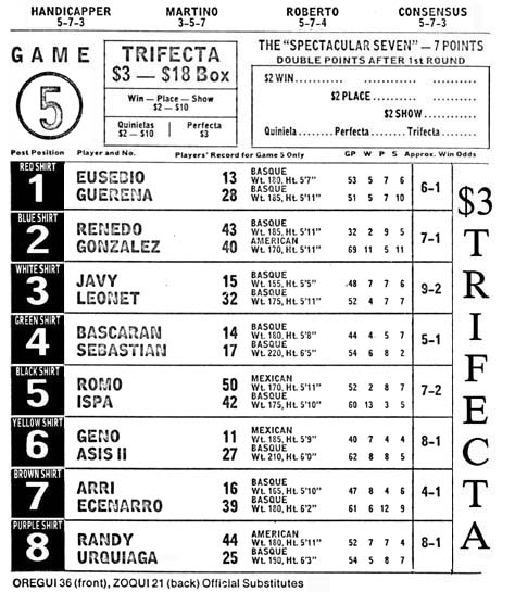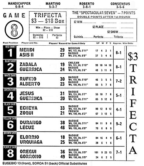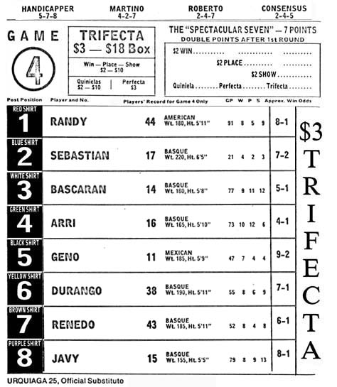 That leaves me Alberto (#7) and Guerrica (#8). I rate them about equal in singles skill, although their styles are different. Alberto has the best falling-down rebote on the World Jai-alai roster, but sometimes has trouble with stand-up rebotes near the right side of the court. Guerrica is not as smooth as Alberto, but is a great competitor who gives 101% on every play. I finally choose Alberto on the grounds that he's looked sharper the last few times I've seen him play singles.