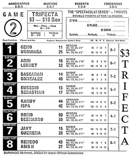 In this game there is another standout, Javy and Leonet in post position 3. Actually, Teams 1 and 2 are higher rated, but Javy and Leonet's team record is one of the best on the World Jai-alai roster. In 50 games together they have 7 wins and 11 seconds.